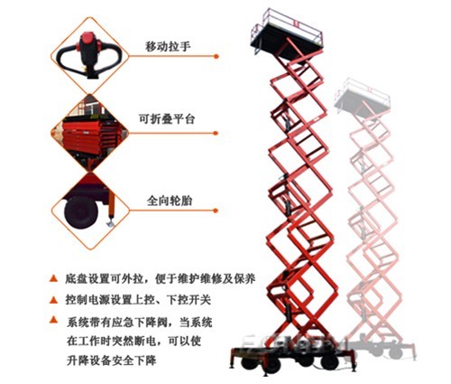 特點:舉升機構采用高強度錳鋼鉅形管制作。設有防止升降機超載的安全保護裝置。設有防止液壓管路破裂的安全保護閥。設有停電情況下的應急下降裝置。該產品適用于各行業高空設備安裝、檢修等可移動性高空作業。根據不同要求可選擇不同動力形式(如:三相交流電源、直流電源),加配上手動液壓裝置,可在停電或無電源場所照常升降工作,并可加伸縮平臺,在平臺長度不足時可延伸至所需位置,從而提高工作效率。是現代高大建筑、設備之理想配備產品,是高空安全文明生產之必備。