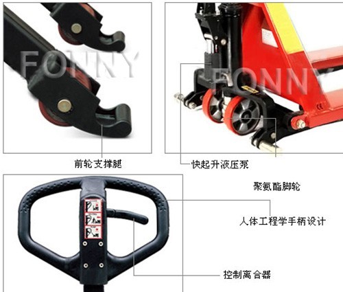 • 重載設計:4毫米厚的鋼板貨叉框架和較大升降活塞確保此型搬運車達到額定載重量