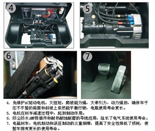• 免維護(hù)AC驅(qū)動(dòng)電機(jī),大扭矩,爬坡能力強(qiáng),大牽引力,動(dòng)力強(qiáng)勁,確保車子在不平整的路面和斜坡上依然能平衡行駛,電瓶使用壽命更長(zhǎng)。